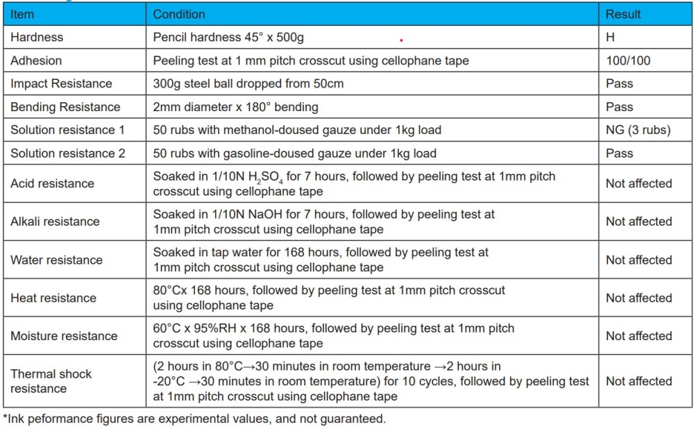 | Mixing ratio | • Ink: D-Hardener = 100:10) • Gel phenomena may occur after 6-8 hours of usage at room temperature after mixing, leading to reduced physical performance. |